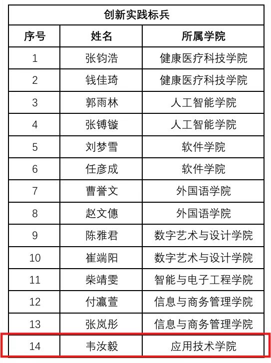 特别值得庆贺的是,我院肖亮老师指导的“AI营养师”智慧营养食堂管理系统项目负责人韦汝毅同学,凭借在项目中的核心引领作用、突出的创新思维和扎实的实践表现,荣获“创新实践标兵”称号,成为此次评比中我院个人荣誉的重要斩获者。作为项目负责人,韦汝毅统筹方案设计、技术研发与成果落地,展现极强统筹与攻坚能力。项目整合AI与营养学,实现个性化配餐等核心功能,助力食堂服务升级。他带领团队攻克技术难关,其创新与实践精神获评审认可,也为全院学子树立了“敢于创新、勇于实践、争当标兵”的良好榜样。
