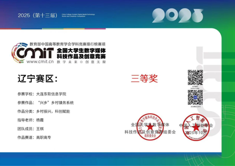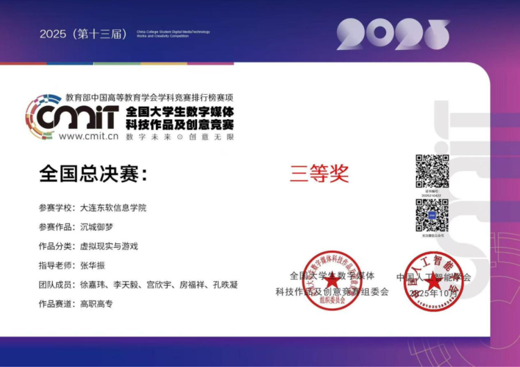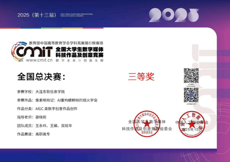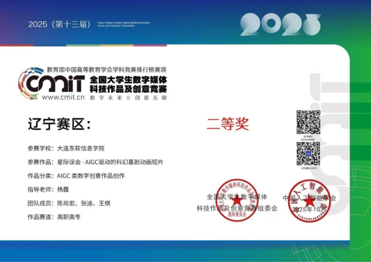 本次赛事落地哈尔滨工业大学,是入选全国高校竞赛权威榜单的高水平赛事,聚焦智能科技与创意设计融合前沿,旨在提升学子实践能力、激发创新创业潜能。我院参赛作品覆盖影视与动漫设计、民族文化创新表达、科技创意传播等领域,兼具技术质感与文化温度:《大连印象》以影视动漫定格城市风貌,尽显地域特色;《傩境》《AWARE》深耕文化传承与儿童科普,以多模态交互打造沉浸式体验;《智启华夏工坊》借AI技术赋能传统发明传承,用科技讲好中国故事,每部作品均凝聚团队协作智慧与指导教师悉心打磨心血。