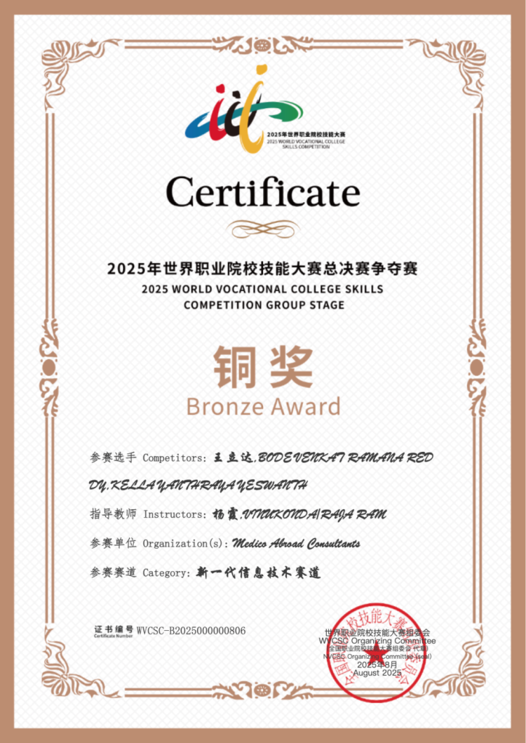 国际赛道则有王立达率队,与Kella Yanthraya Yeswanth和Bode Venkat Ramana Reddy共同代表我院在国际赛场展现精湛的技术,与灵活的应变挑战。在团队协作环节,三人配合默契、互补短板,充分展现了扎实的专业素养与良好的团队精神。最终凭借优异表现斩获国家级铜奖,为学校职业教育成果再添浓墨重彩的一笔。